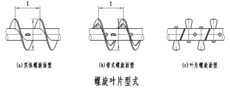 ⑴螺旋輸送機的螺旋葉片有實體螺旋面型、帶式螺旋面型及葉片螺旋面型三種,分別如下圖(a)、(b)、(c)所示。實體螺旋面稱為S制法,其螺旋節(jié)距為葉片直徑的0.8倍,適用于輸送粉狀和粒狀物料。帶式螺旋面又稱D制法,其螺旋節(jié)距與螺旋葉片直徑相同,適用于輸送粉狀及小塊物料。葉片式螺旋面應用較少,主要用于輸送粘度較大和可壓縮性物料,在輸送過程中,同時完成攪拌、混合等工序,其螺旋節(jié)距約為螺旋葉片直徑的1.2倍。